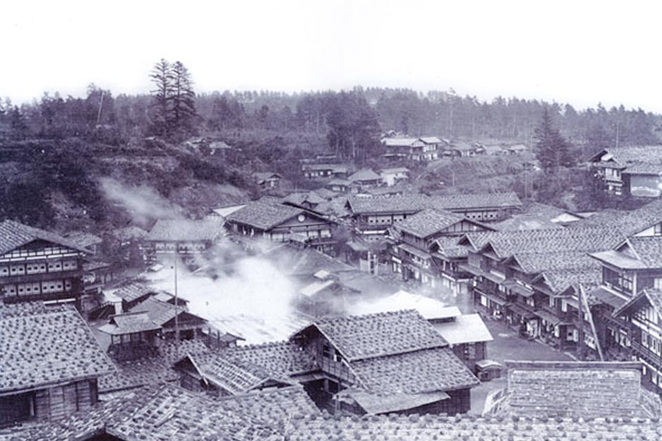 当時当館は湯畑に面して建っておりました。湯煙の向こうに見えるのが当館です。